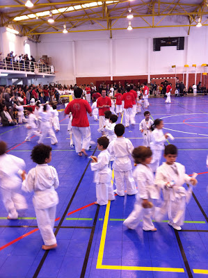 Este Sábado foi dia de estágio de Karaté para o João (cinto castanho) e o Miguel (cinto branco com 1 risca amarela). Para o Miguel foi também o dia de mudança de cinto (para branco com 2 riscas amarelas). Devido à diferença de idades tive que esperar 4 horas para que chegasse a vez do grupo do João. Durante este tempo deu tempo para desenhar (eles e eu), fazer macacadas no insuflável (eles... e eu roído de inveja), dormir (o Miguel) e fazer um pequeno teste com uma aplicação do meu telemóvel chamada Timelapse, e que promete ser uma óptima ferramenta para fazer os vídeos "making of" (ver vídeo).